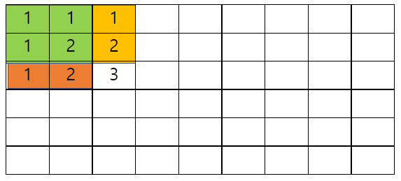 이 그림은 주황색 정사각형이 크기 1인 정사각형이 될 경우이다. 이 경우 흰색으로 칠해진 좌표를 좌하단으로 삼는 최대 크기의 정사각형은 2가 된다. 이 아이디어를 점화식으로 표현하면 다음과 같다.